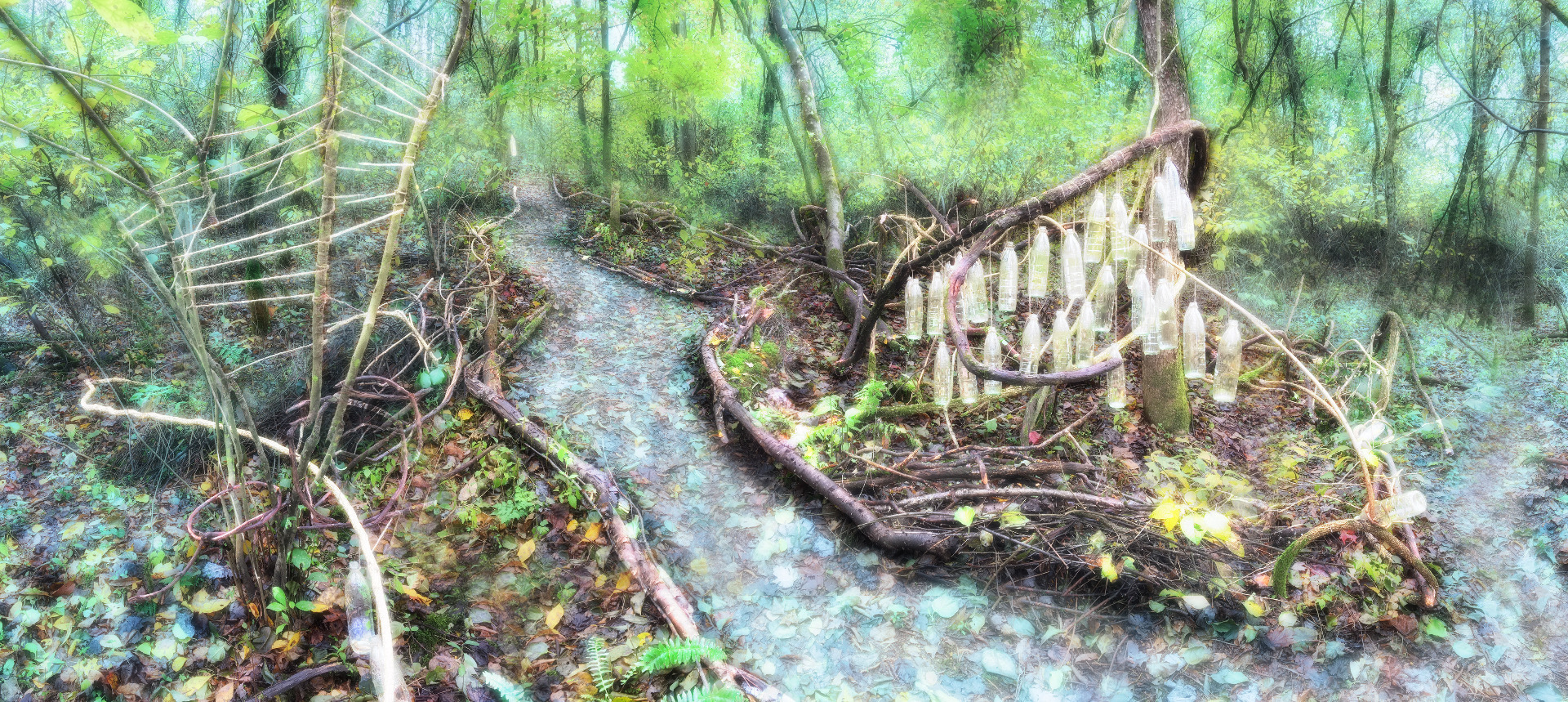 The Forest is my studio, sanctuary, and healing partner. After 33 consecutive months of co-creating, one of the most important aspects of this relationship continues to be the negotiation of pathways. When I first entered, I was not able to make out individual trees for the white noise of thorns and vines. As I adjust to a wilder rhythm, I perceive energetic buffers radiating from the trees. As I respect those boundaries, harmonious routes to navigate the terrain become obvious. I vision with those in my immediate vicinity – plants, fungi, animals, and other energies – observing opportunities to work with fallen branches, living vines, and other plant partners to sculpt islands of micro-ecosystems as I simultaneously clear pathways. During this process, the vibrations of my interactions are gathered as data by the mycelial network, analyzed and distributed. From here the network suggests places I have been invited to visit and co-create further, by shifting my awareness, eerily like an algorithm.